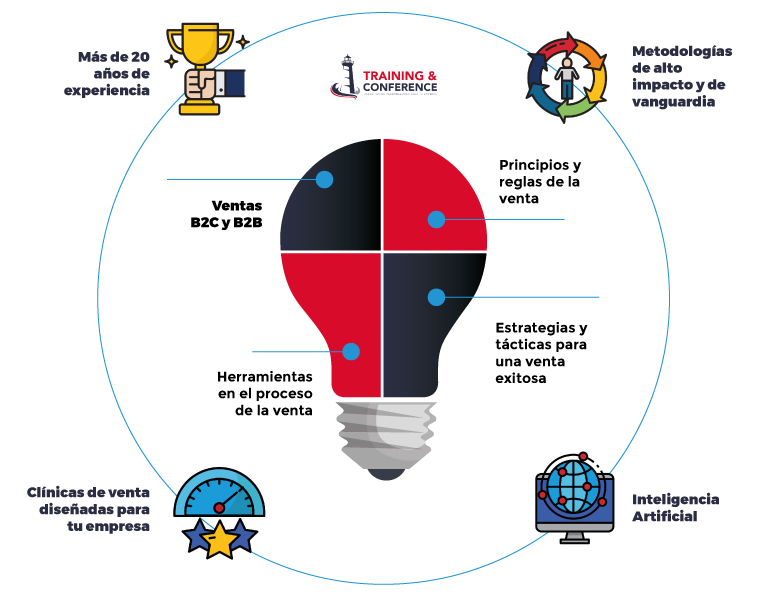 Les enseñamos habilidades de cada parte del proceso de la venta: planeación, prospección, conexión con el cliente, detección de las necesidades, diferenciadores, manejo efectivo de objeciones, sentido de urgencia, indicios de interés, técnicas efectivas de cierre, seguimiento, venta cruzada y postventa.
